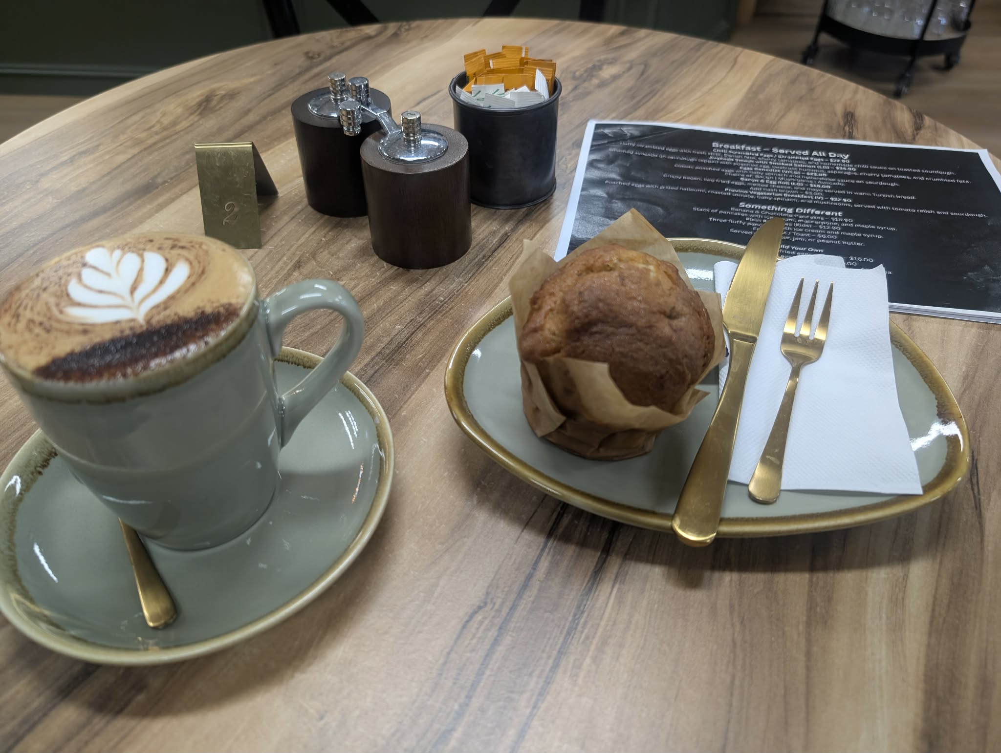 I’m most pleased I did. The cappuccino blueberry muffin (warmed, with butter) was delicious. The café is a little more upmarket than most for this town; the vibe welcoming (even when empty) and I had a delightful chat with the lass behind the counter.
