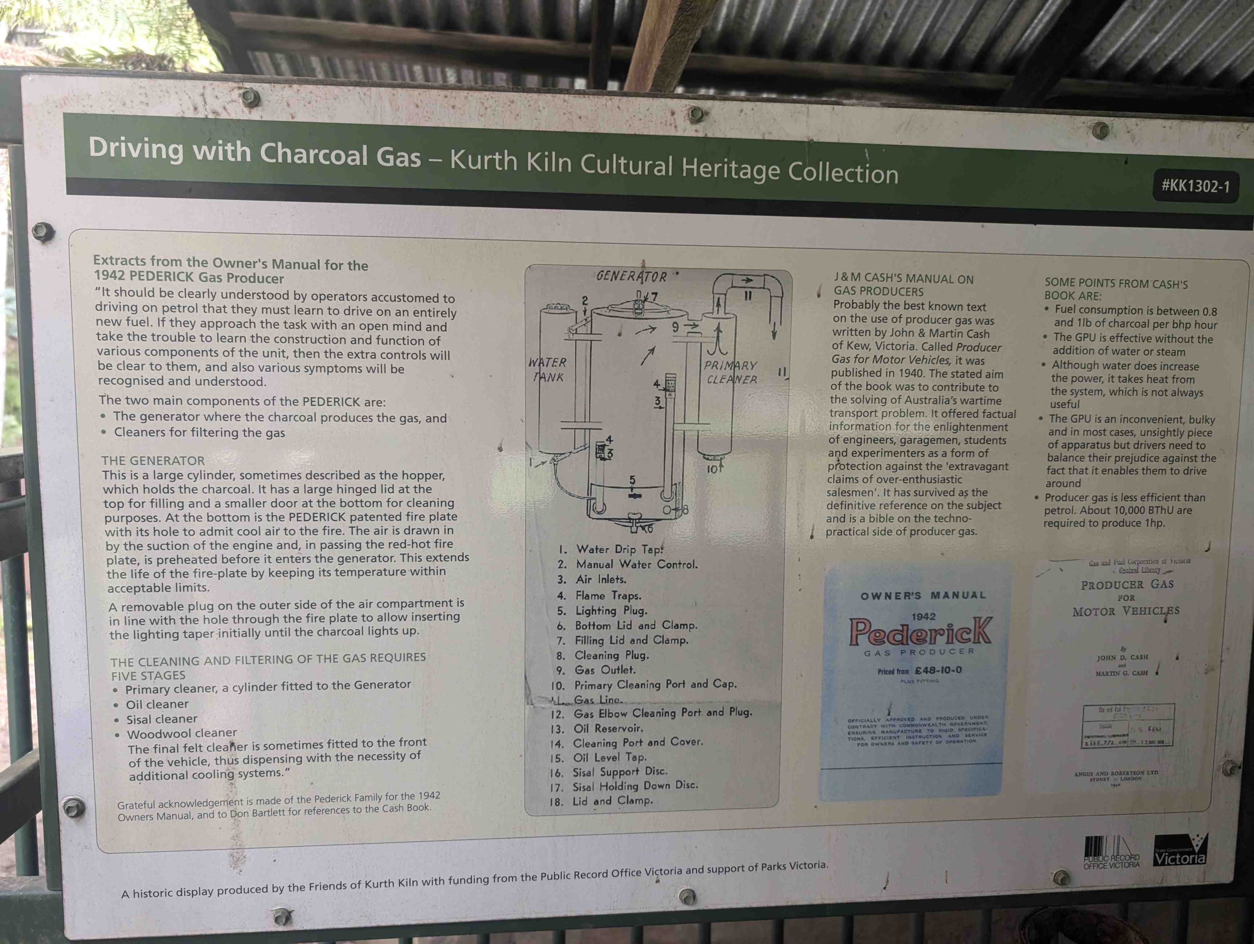 Informational sign titled "Driving with Charcoal Gas" from the Kurth Kiln Heritage Collection. It features text, diagrams of a gas generator, and manuals for Pedrick gas producers, conveying historical and technical details.